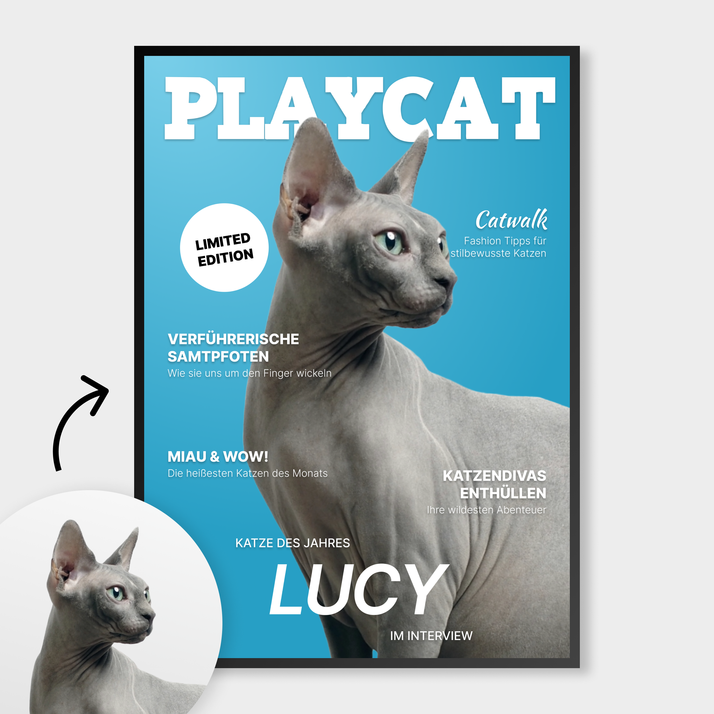 Das personalisierte PLAYCAT Poster lässt deine Katze zu einem Playboy-Cover Star werden. Lade ganz einfach ein Foto von deiner Katze hoch und unsere KI entfernt automatisch den Hintergrund.